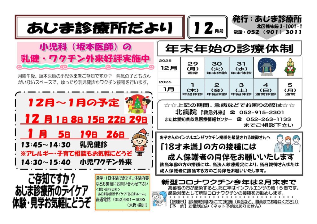 あじま診療所だより(12月号)~小児科(坂本医師)の乳健・ワクチン外来好評実施中🍀💉~