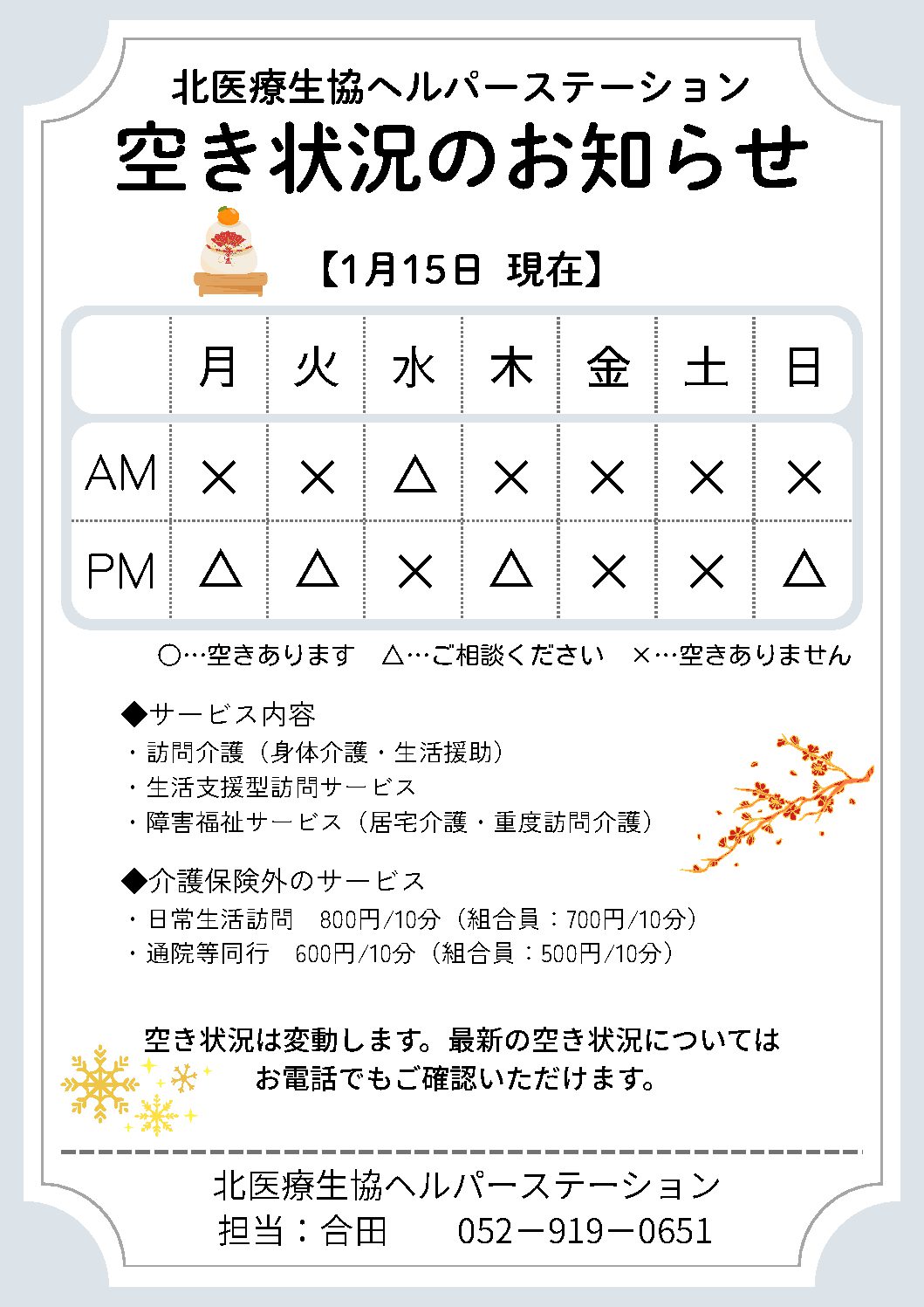 北医療生協ヘルパーステーション 2026年01月15日 ヘルパーステーション 1月のご利用可能曜日・時間帯 1月15日現在のご利用可能曜日・時間帯のお知らせです。詳細はお電話にてお問い合わせください。 クリックするとPDFが表示されます