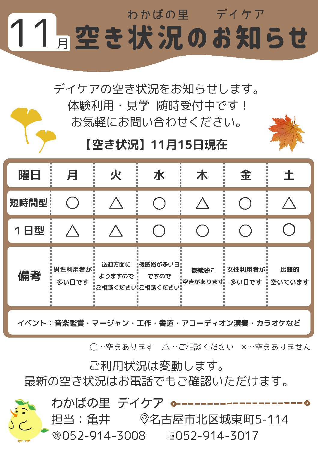 生協わかばの里 介護老人保健施設 2025年11月15日 わかばの里デイケア 11月の週間空き状況 わかばの里デイケア 10月の週間空き状況です。 詳細はお電話にてお問い合わせください。 担当:亀井 TEL:052-914-3008 クリックするとPDFが表示されます