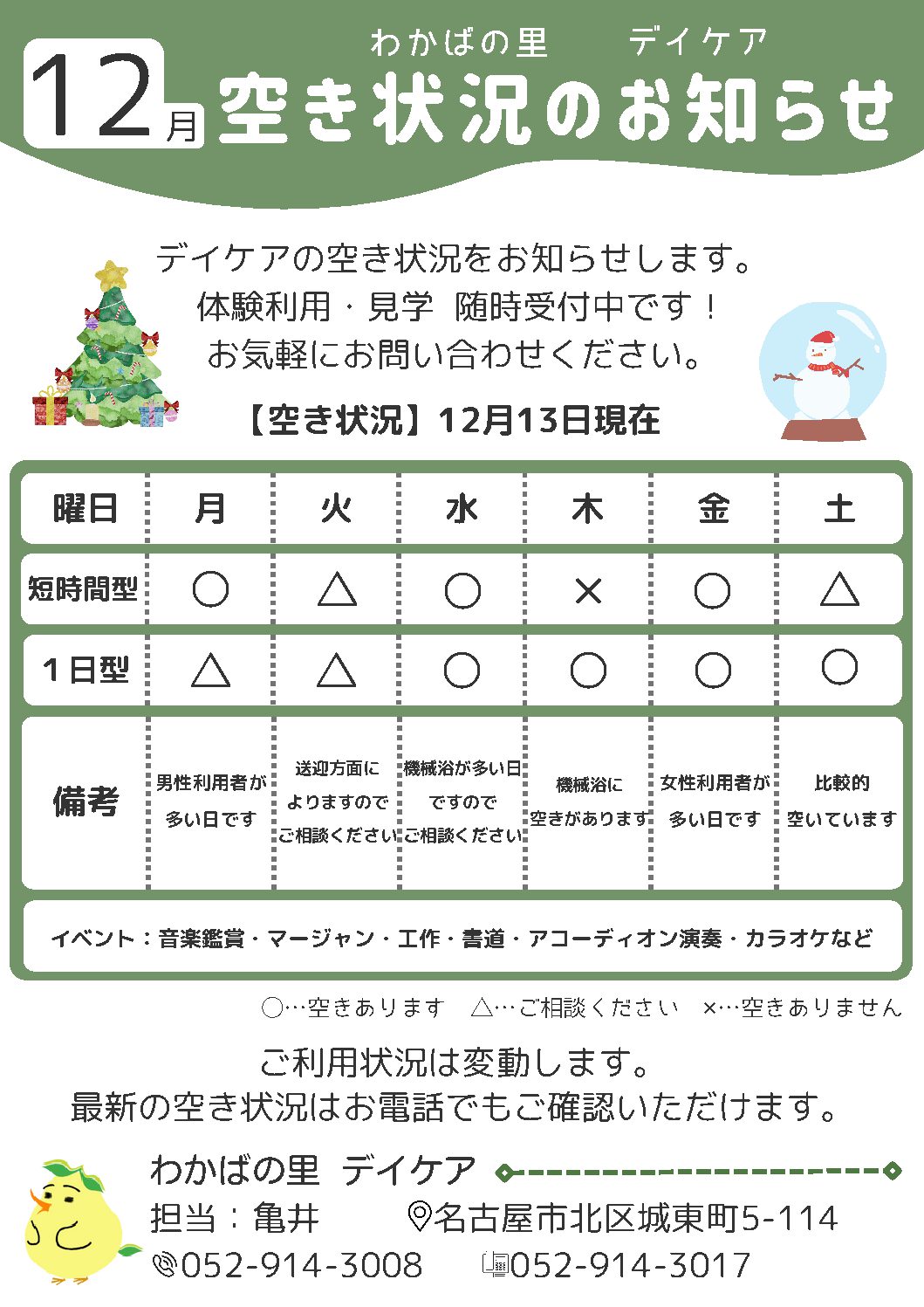 生協わかばの里 介護老人保健施設 2025年12月13日 わかばの里デイケア 11月の週間空き状況 わかばの里デイケア 10月の週間空き状況です。 詳細はお電話にてお問い合わせください。 担当:亀井 TEL:052-914-3008 クリックするとPDFが表示されます