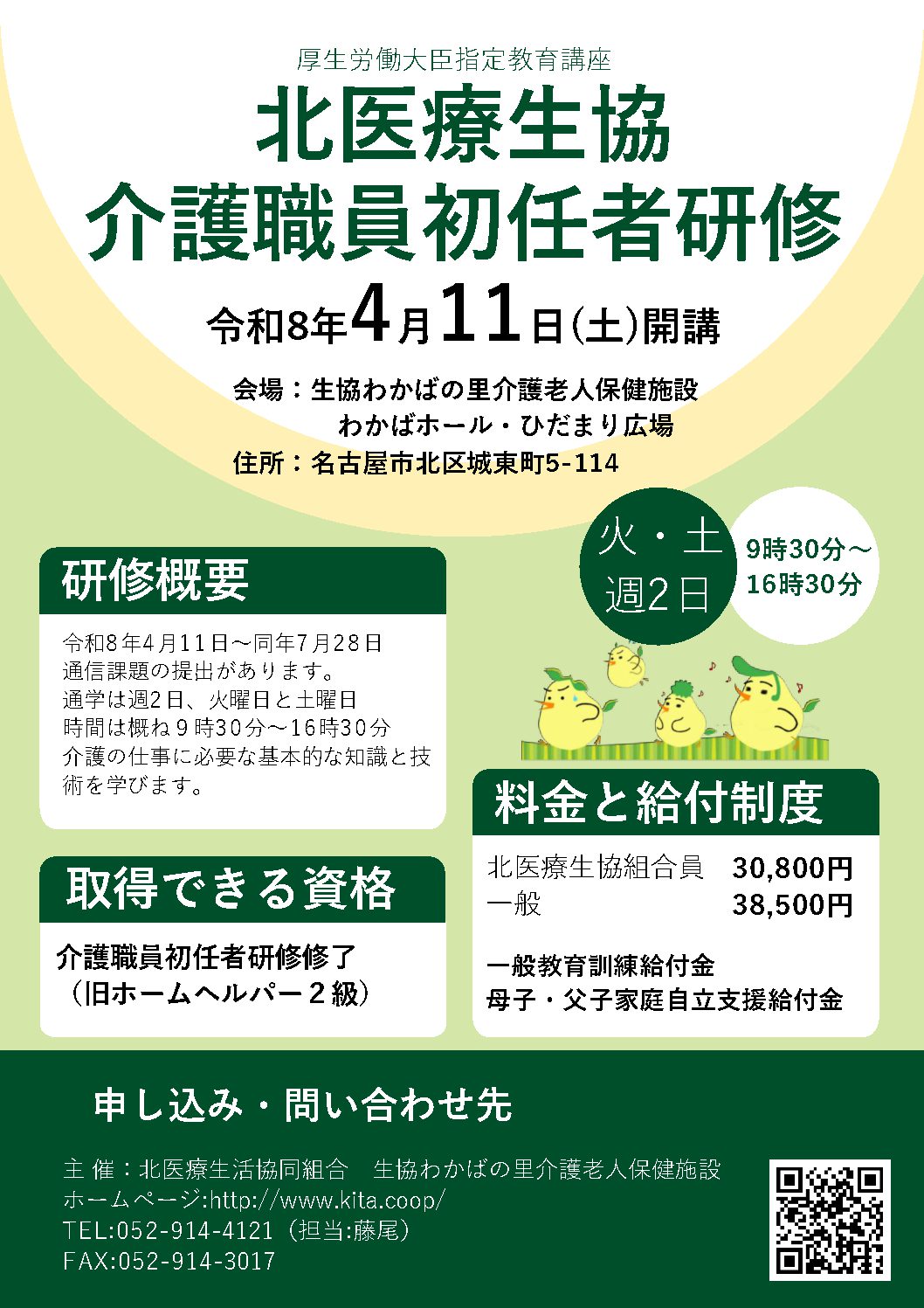 生協わかばの里 介護老人保健施設 組合員の皆様へ 2026年01月05日 2026年度初任者研修 受講申し込み開始しました! 2026年4月開講の介護職員初任者研修の受講申し込みを開始しました。 詳細は以下のページをご覧ください。 介護職員初任者研修について クリックするとPDFが表示されます