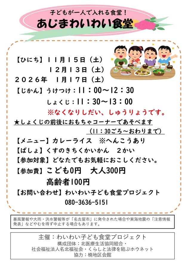 【あじまわいわい食堂 11月~1月】子どもが一人で入れる食堂🍛!