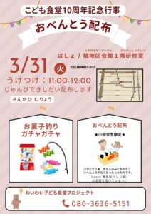 【3月31日/楠地区会館1F】小中学生限定☆お弁当配布&お菓子釣り・ガチャガチャ