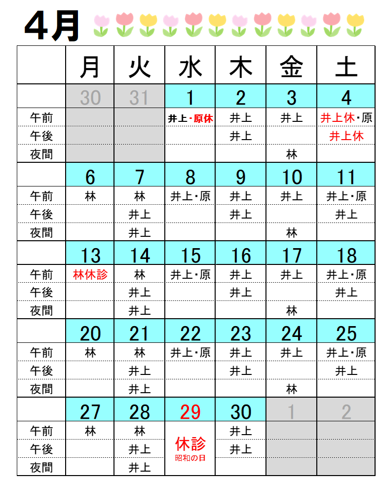 | 曜日 | 開始時間 | 担当医師 |
