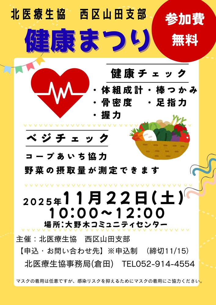 【西区山田/大野木コミセン】健康まつり🌟~べジチェック🥕・健康チェック~案内